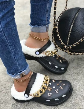 1360 Women Thick Sole Plush Slippers Gold Chain Rivets crocs